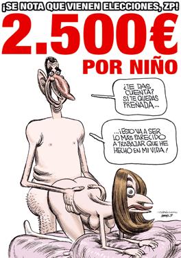 La viñeta hace referencia a la ayuda económica a la maternidad anunciada por el presidente del Gobierno español, José Luis Rodríguez Zapatero, durante el debate del Estado de la Nación. Bajo un gran titular en rojo que dice "2.500 euros por niño" aparece una caricatura de la pareja practicando sexo. Él le pregunta a ella: "¿Te das cuenta? Si te quedas preñada... Esto va a ser lo más parecido a trabajar que he hecho en mi vida".